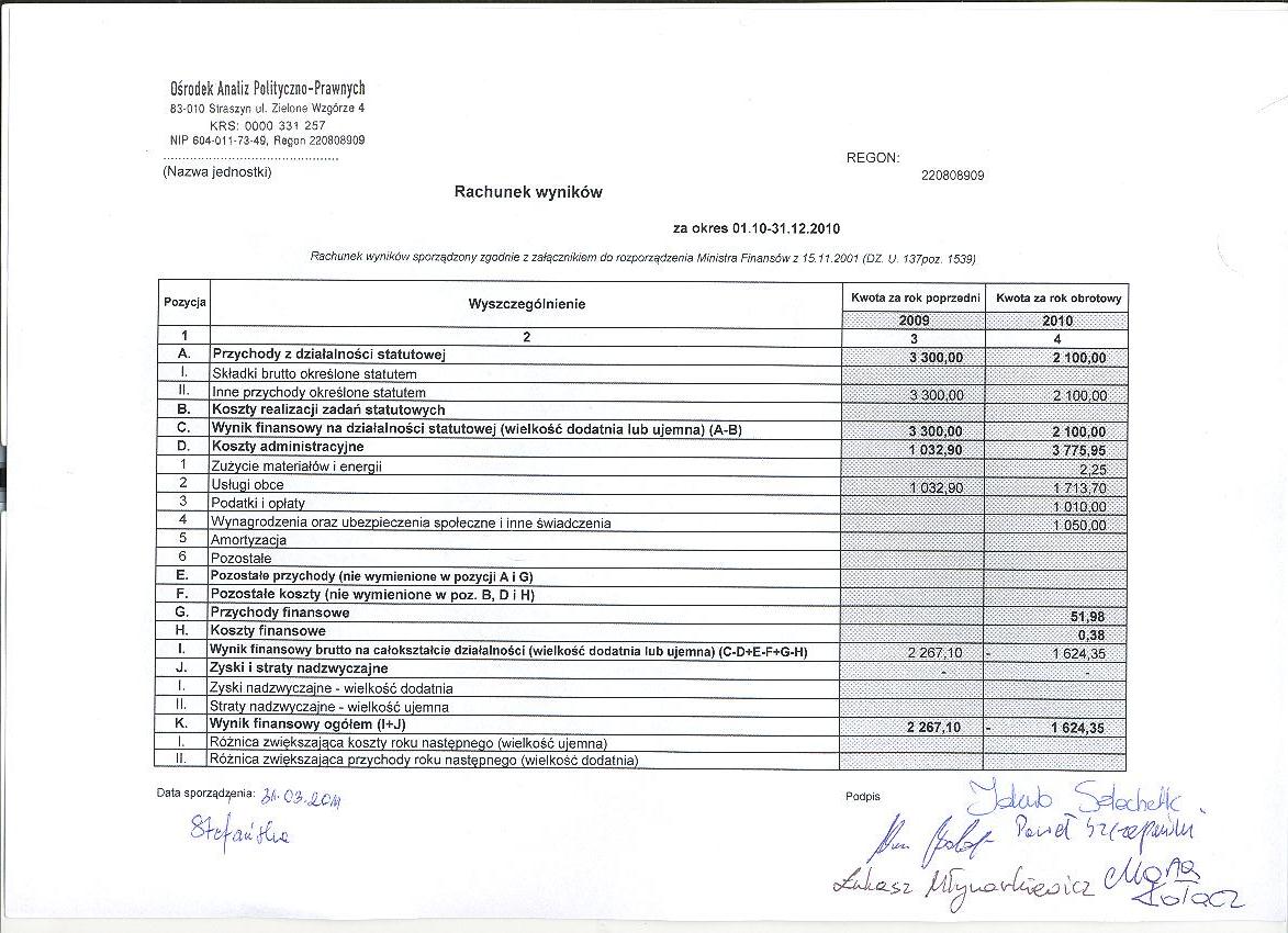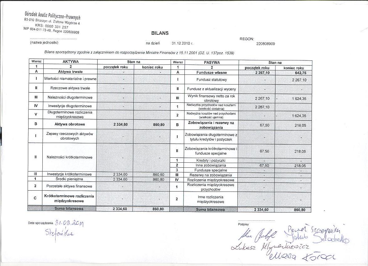 Sprawozdanie finansowe za rok 2010